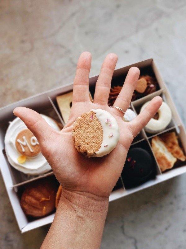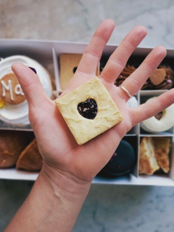 •2 alfajorcitos "patagónicos": rellenos de ddl y mermelada casera de frutos rojos, bañados en choco semiamargo.