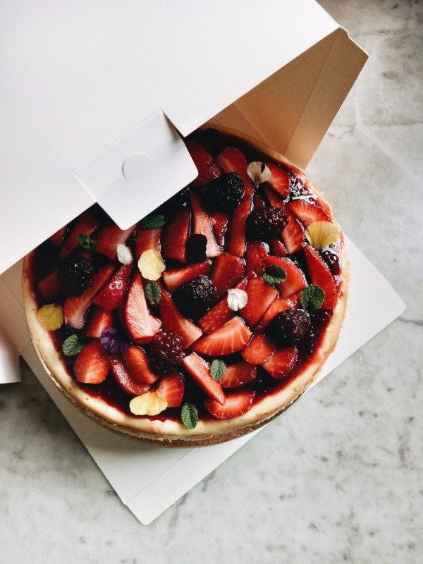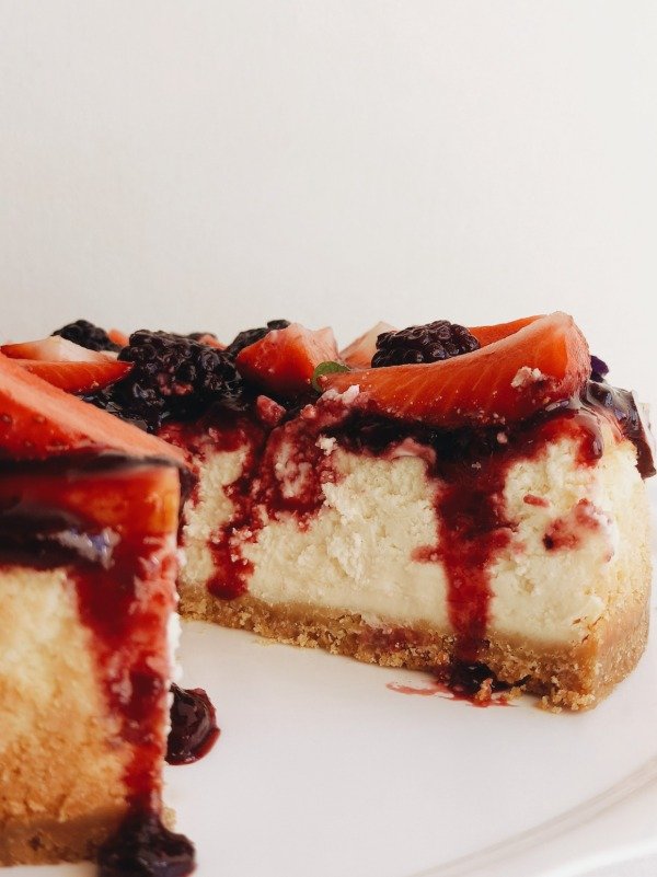 Base de galletas molidas, crema de queso, mermelada casera de frutos rojos y fruta por arriba.